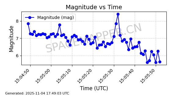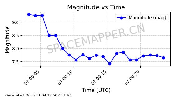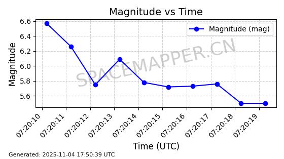 | STARLINK-3667 | 51999 | 51999 | 2022-03-09 同日期轨道 2022-025AV 同批次轨道  |  已陨落 | 87分钟 | 53.2023 | 138.585 | 150.783 | 0.0009349 | 2025-10-23  08:09:05  |  ||