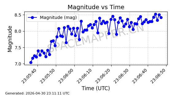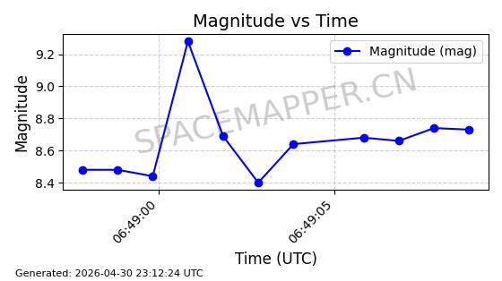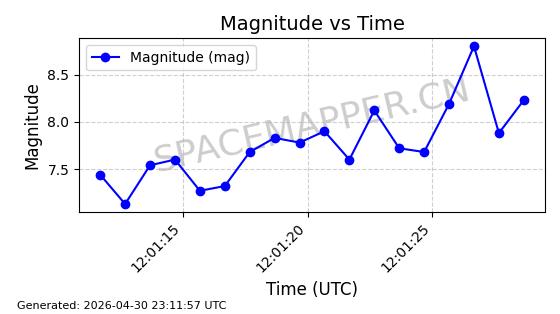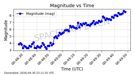 | STARLINK-3694 | 51957 | 51957 | 2022-03-09 同日期轨道 2022-025B 同批次轨道 | 在轨 | 94分钟 | 53.1580 | 469.95 | 471.48 | 0.0001116 | 2026-04-30 04:00:01 | ||
