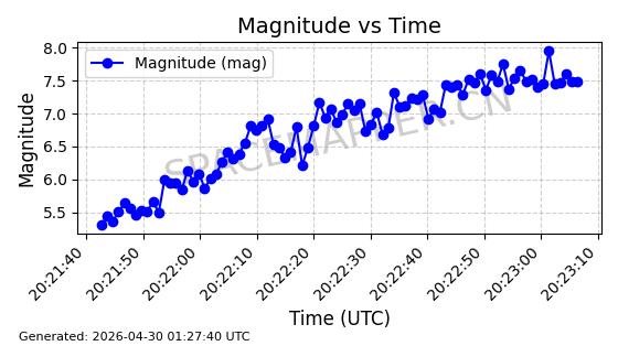 | STARLINK-3597 | 51898 | 51898 | 2022-03-03 同日期轨道 2022-022AY 同批次轨道 | 在轨 | 95分钟 | 53.2173 | 538.881 | 540.635 | 0.0001267 | 2026-04-30 04:39:45 | ||