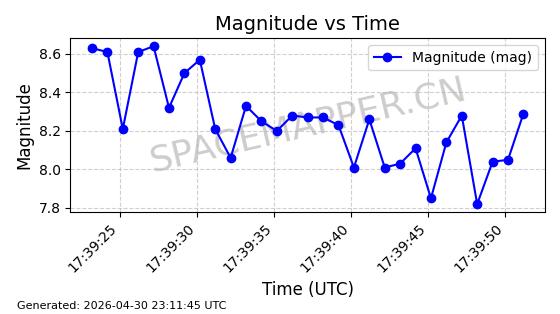 | STARLINK-3639 | 51789 | 51789 | 2022-02-25 同日期轨道 2022-017X 同批次轨道 | 在轨 | 95分钟 | 53.2161 | 539.006 | 540.58 | 0.0001137 | 2026-04-30 04:41:06 | ||