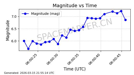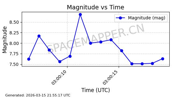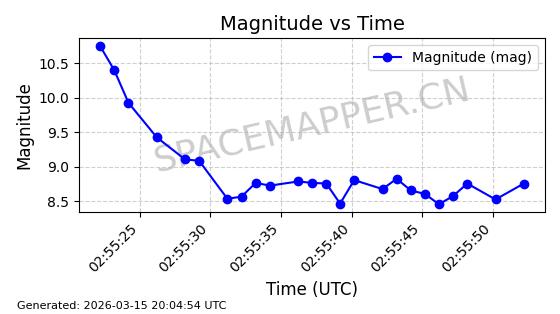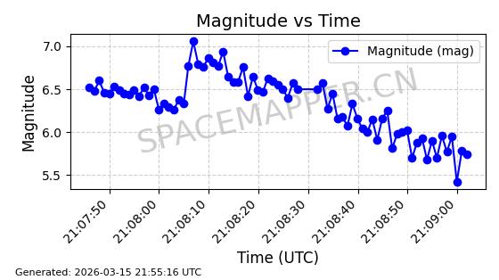 | STARLINK-6155 | 57076 | 57076 | 2023-06-22 同日期轨道 2023-088AE 同批次轨道 | 在轨 | 95分钟 | 43.0005 | 521.9 | 524.206 | 0.0001670 | 2026-03-15 06:00:01 | ||