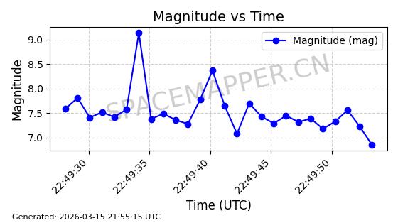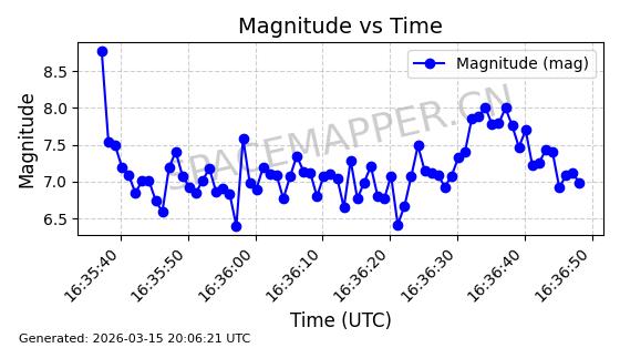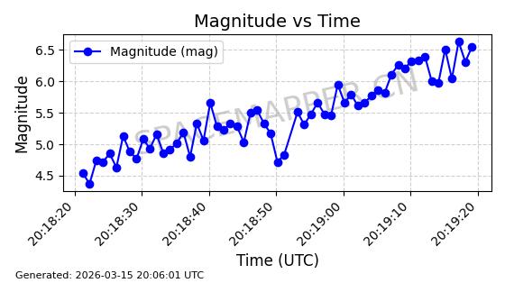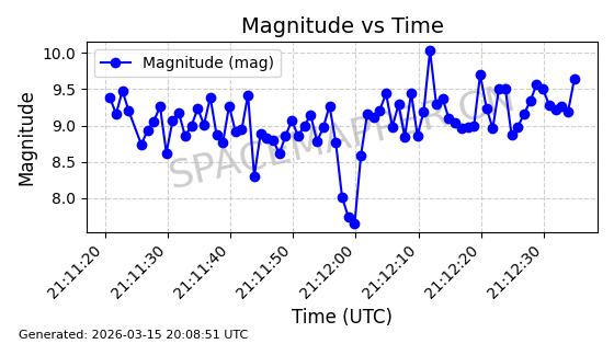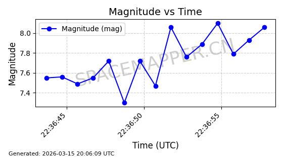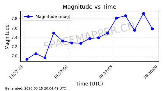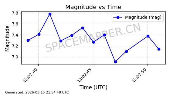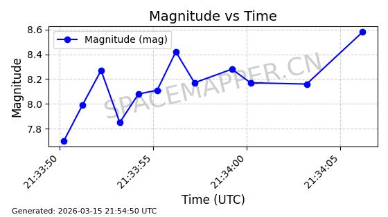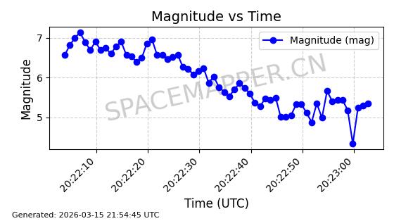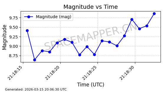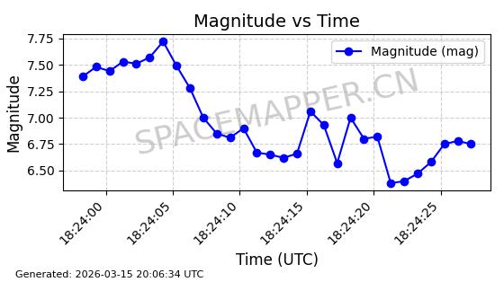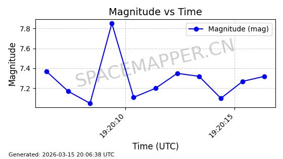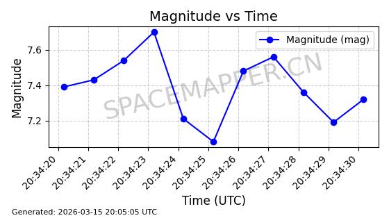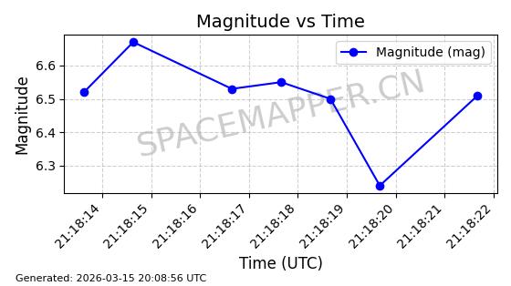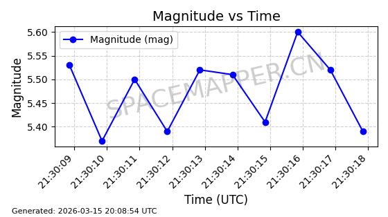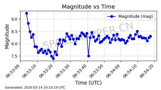 | STARLINK-6207 | 56900 | 56900 | 2023-06-12 同日期轨道 2023-083AA 同批次轨道 | 在轨 | 95分钟 | 43.0000 | 522.349 | 524.327 | 0.0001433 | 2026-03-15 06:00:01 | ||