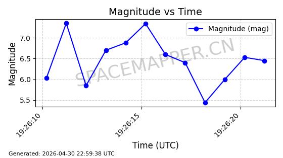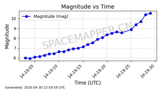 | STARLINK-3922 | 52584 | 52584 | 2022-05-13 同日期轨道 2022-051BA 同批次轨道 | 在轨 | 95分钟 | 53.2174 | 539.224 | 540.246 | 0.0000738 | 2026-04-30 01:55:28 | ||