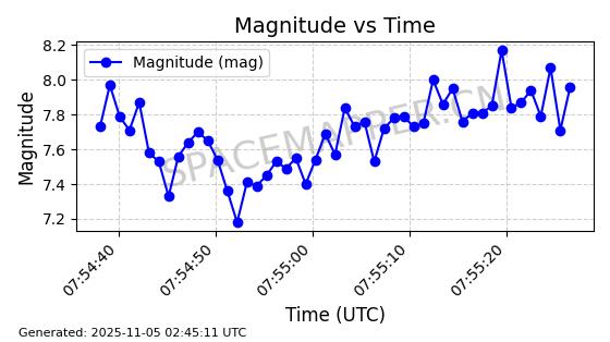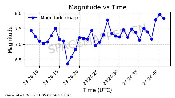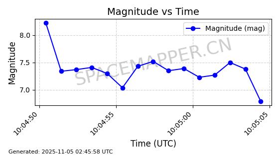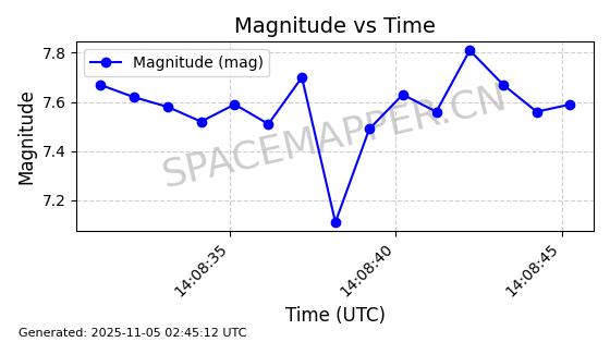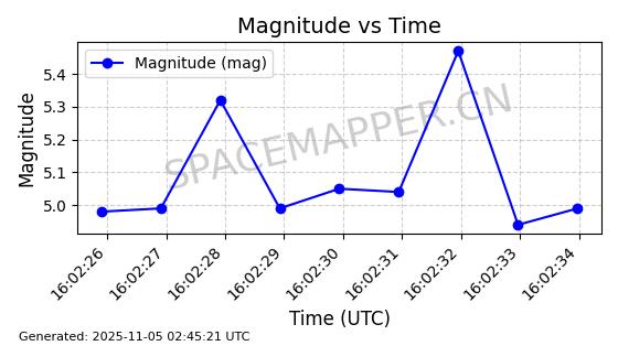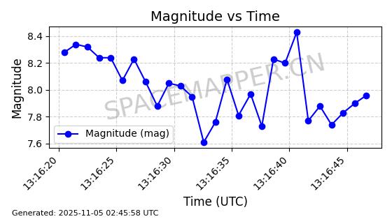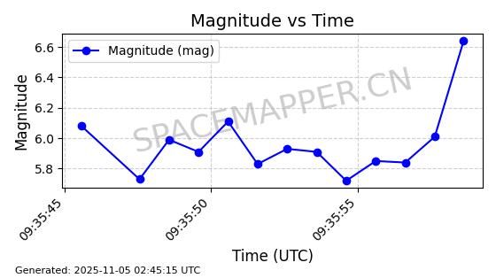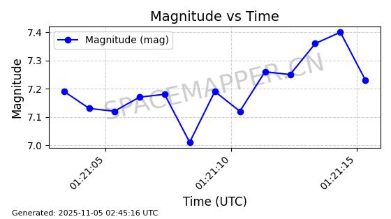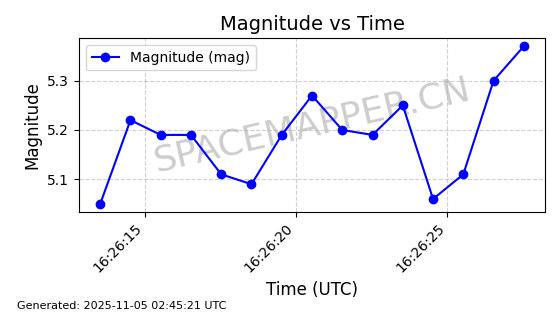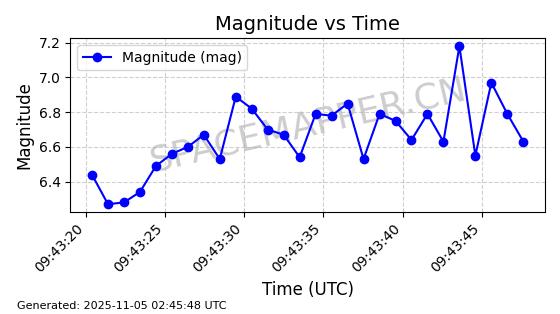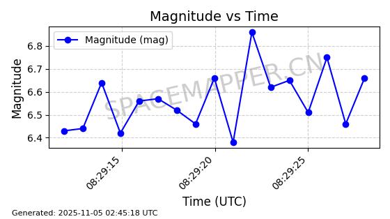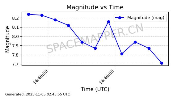 | STARLINK-4273 | 53181 | 53181 | 2022-07-17 同日期轨道 2022-083BB 同批次轨道 | 已陨落 | 88分钟 | 53.1515 | 173.983 | 191.489 | 0.0013341 | 2025-05-17 01:02:50 | ![]() | |