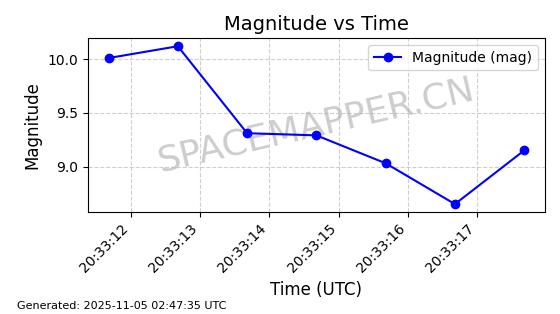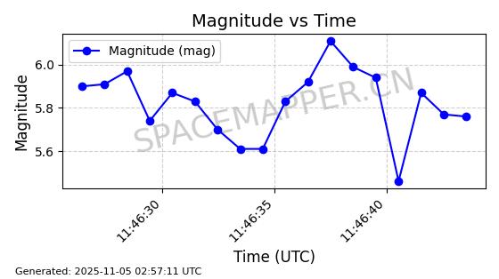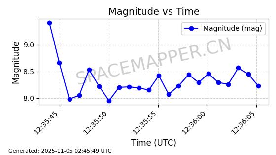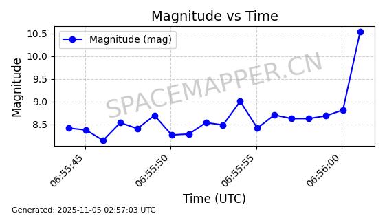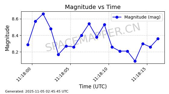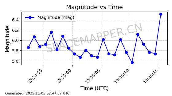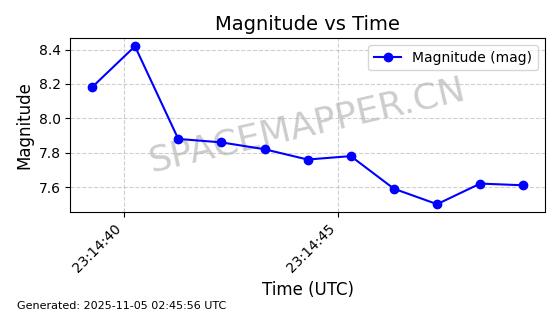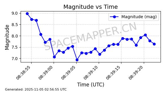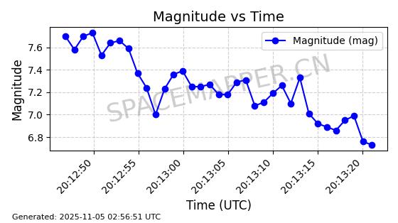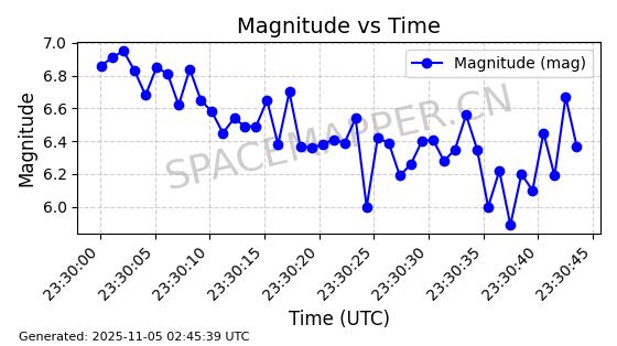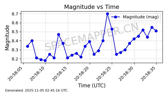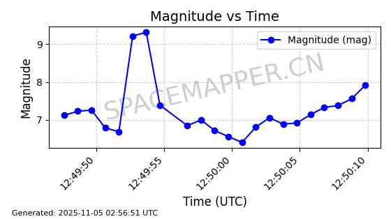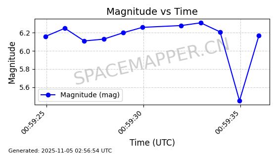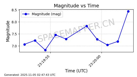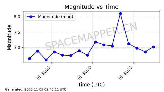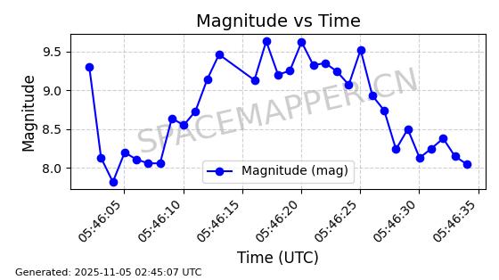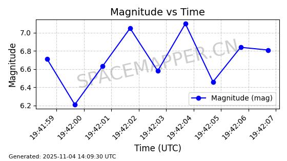 | STARLINK-4329 | 53087 | 53087 | 2022-07-11 同日期轨道 2022-077AW 同批次轨道 | 已陨落 | 88分钟 | 97.6392 | 146.74 | 158.808 | 0.0009239 | 2025-09-01 03:50:59 | ||