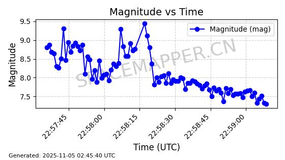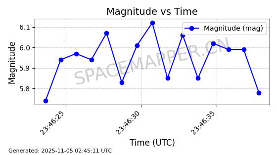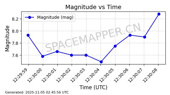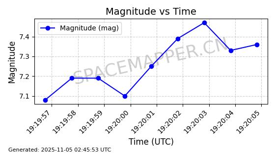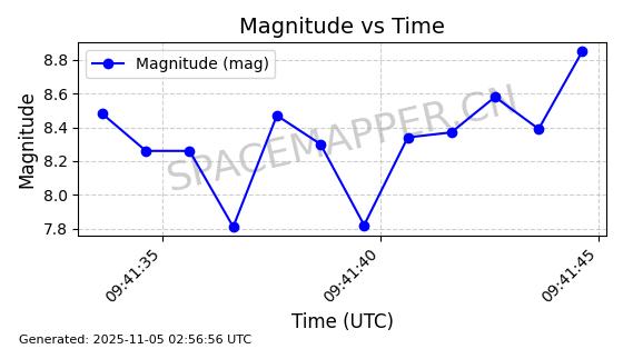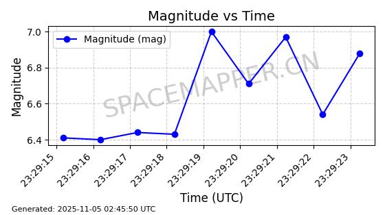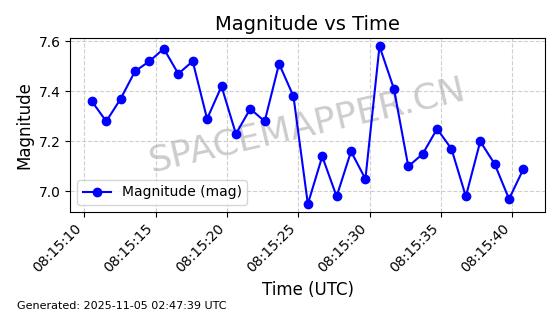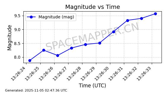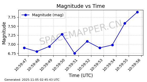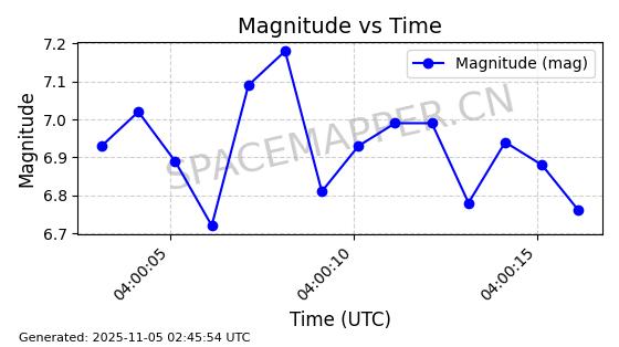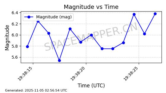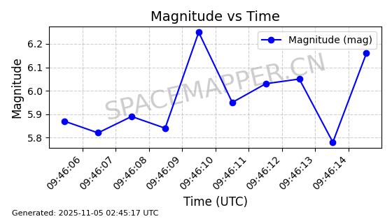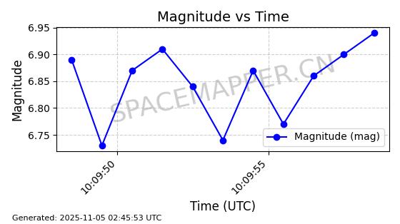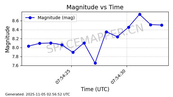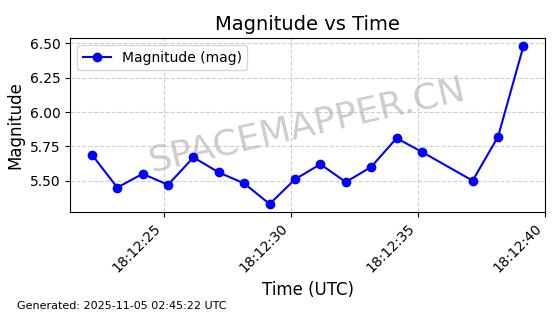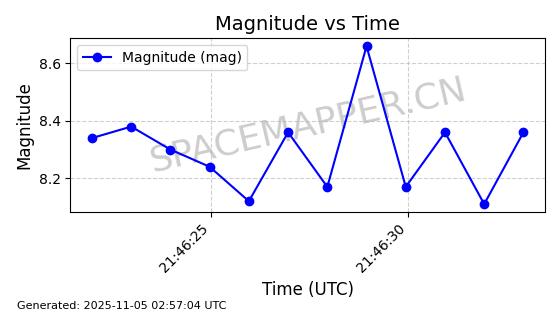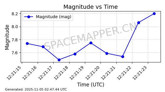 | STARLINK-4329 | 53087 | 53087 | 2022-07-11 同日期轨道 2022-077AW 同批次轨道 | 已陨落 | 88分钟 | 97.6392 | 146.74 | 158.808 | 0.0009239 | 2025-09-01 03:50:59 | ||