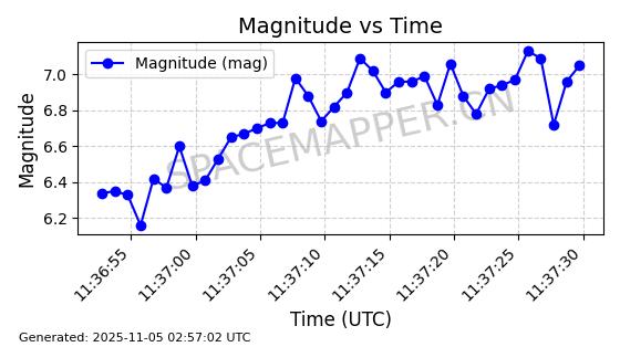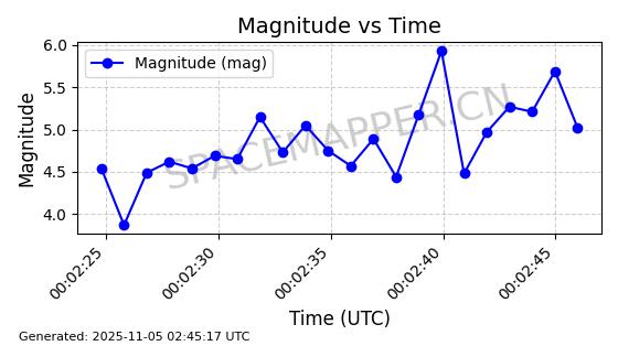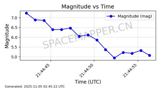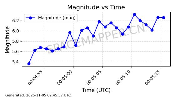 | STARLINK-4301 | 52997 | 52997 | 2022-07-07 同日期轨道 2022-076M 同批次轨道 | 已陨落 | 87分钟 | 53.1934 | 139.813 | 150.189 | 0.0007952 | 2025-02-05 05:01:52 | ||