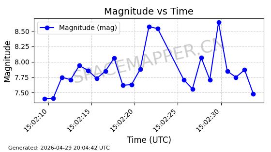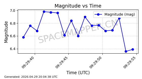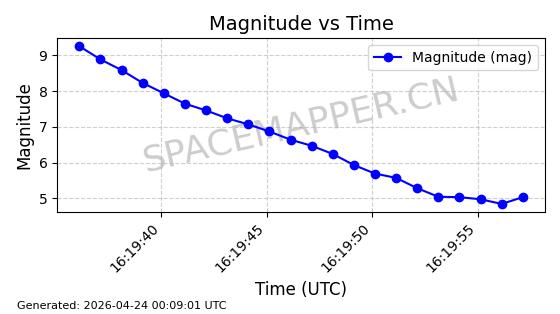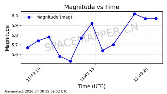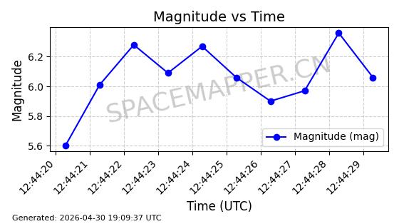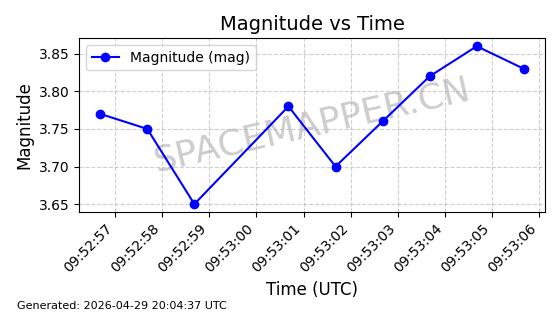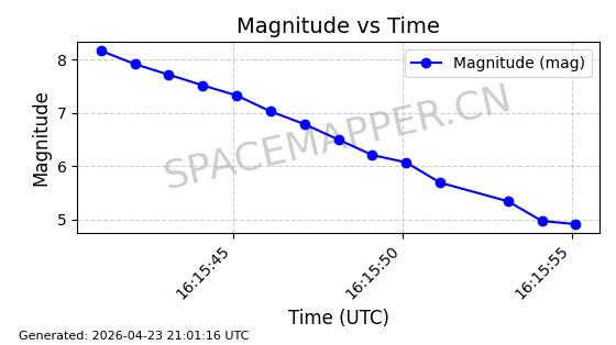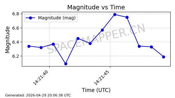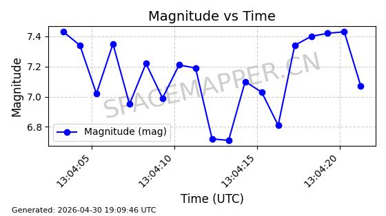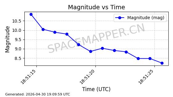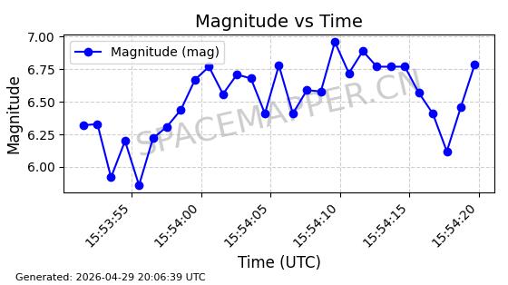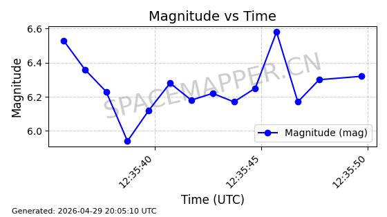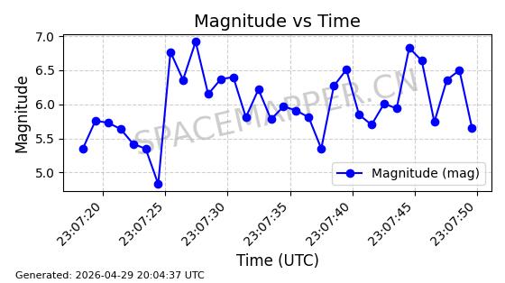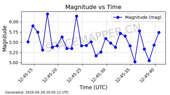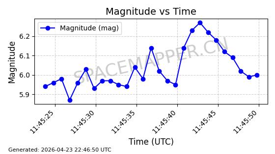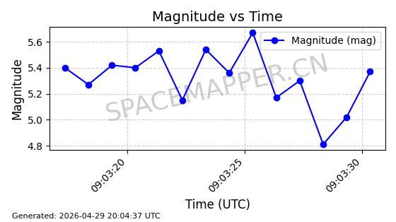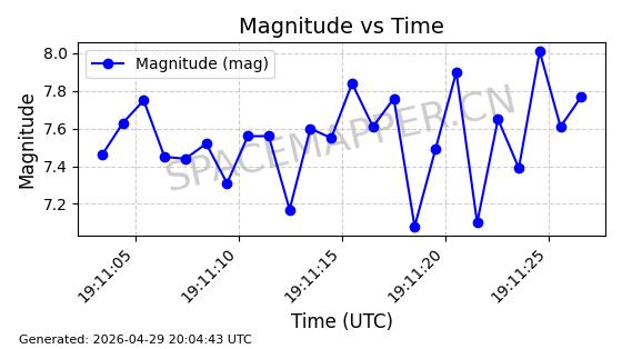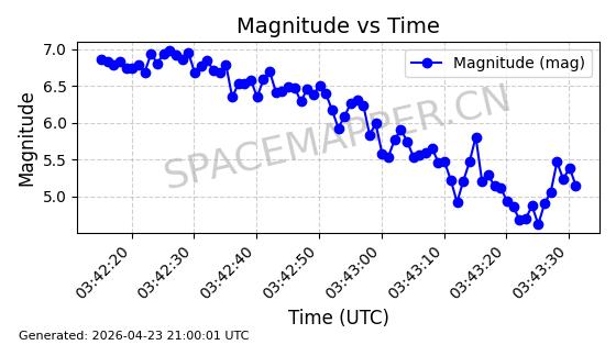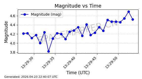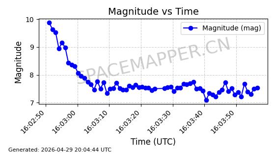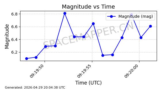 | STARLINK-4465 | 53496 | 53496 | 2022-08-12 同日期轨道 2022-099AH 同批次轨道 | 已陨落 | 88分钟 | 97.6189 | 144.967 | 162.183 | 0.0013178 | 2026-04-20 08:21:12 | ||