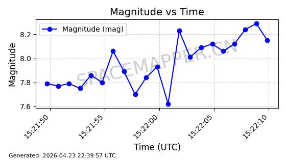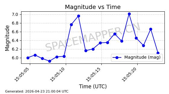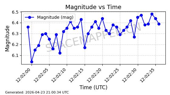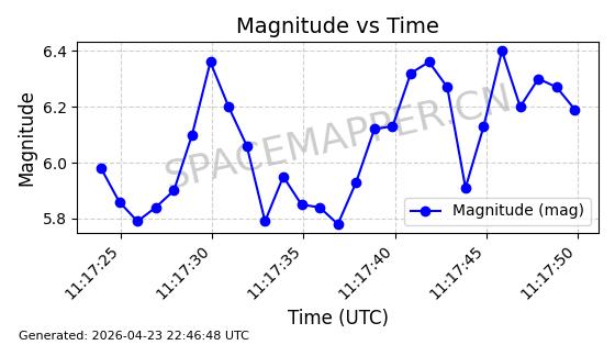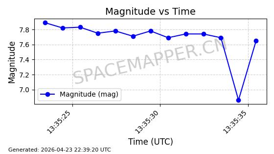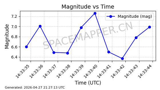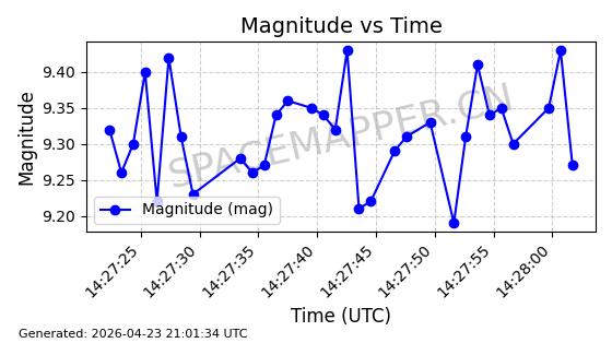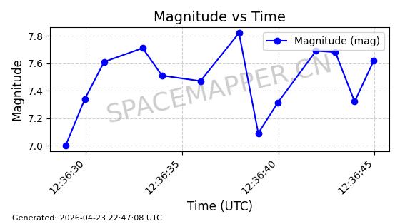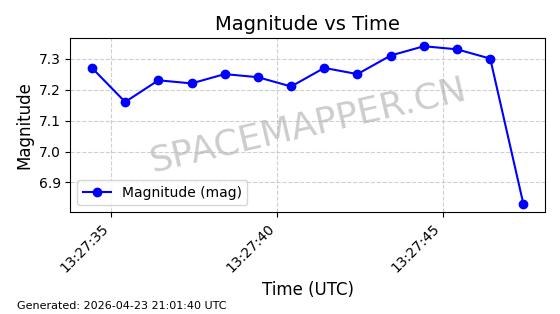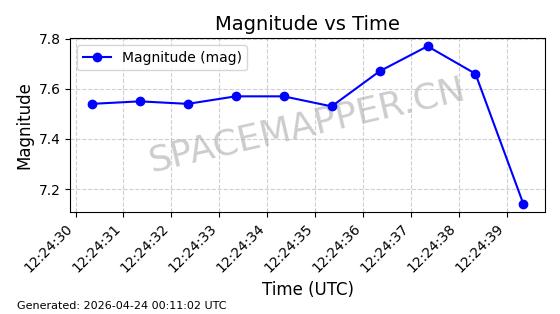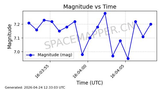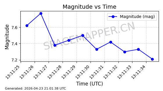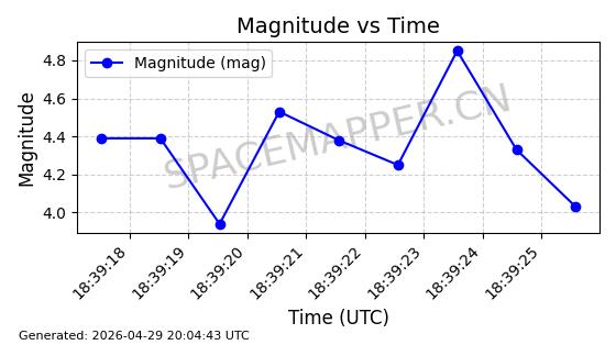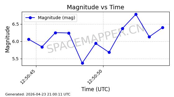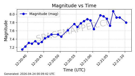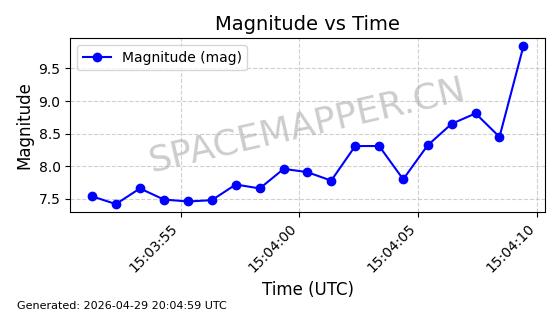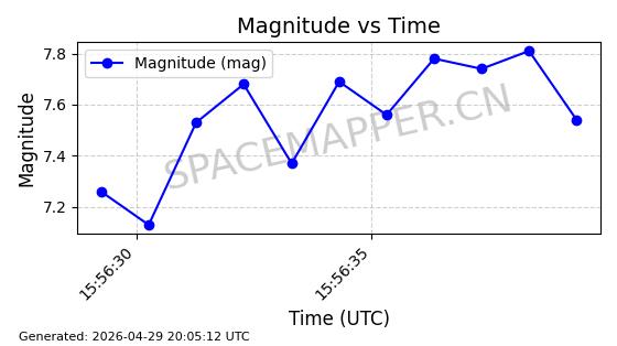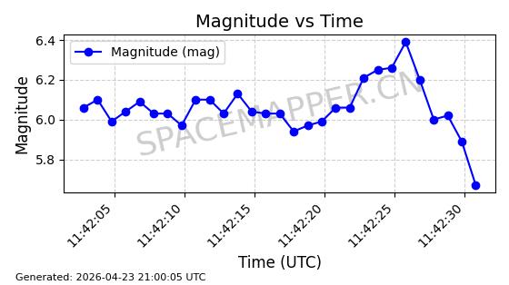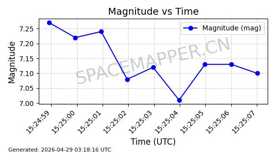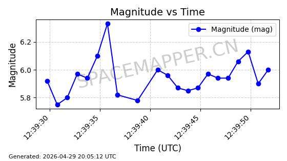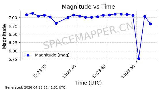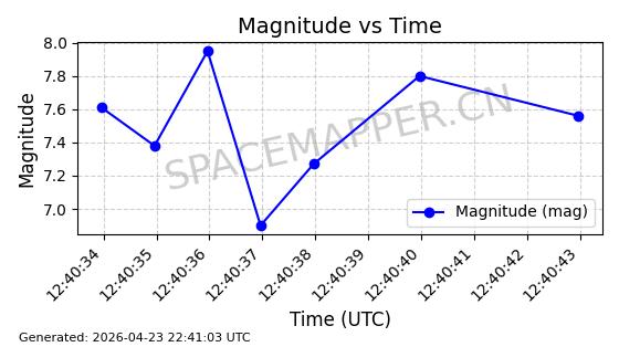 | STARLINK-4465 | 53496 | 53496 | 2022-08-12 同日期轨道 2022-099AH 同批次轨道 | 已陨落 | 88分钟 | 97.6189 | 144.967 | 162.183 | 0.0013178 | 2026-04-20 08:21:12 | ||