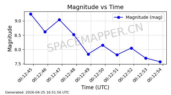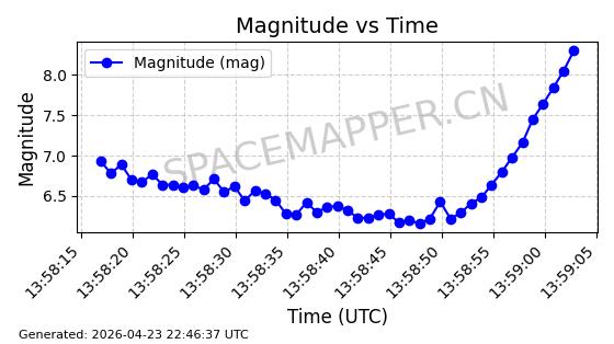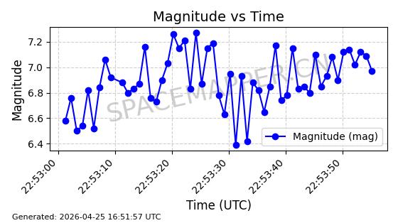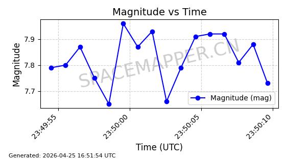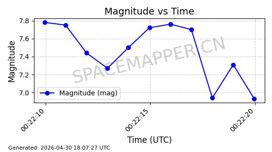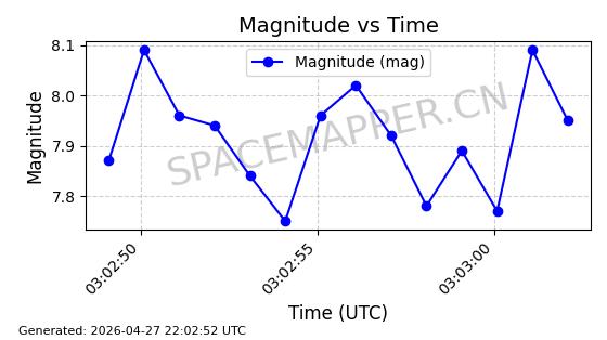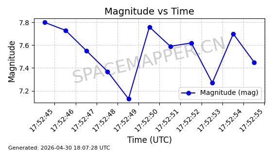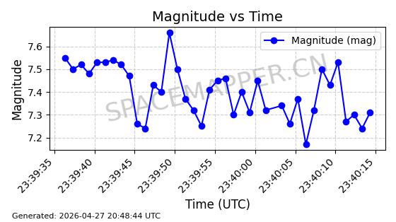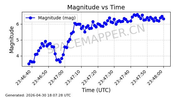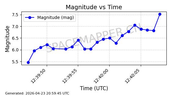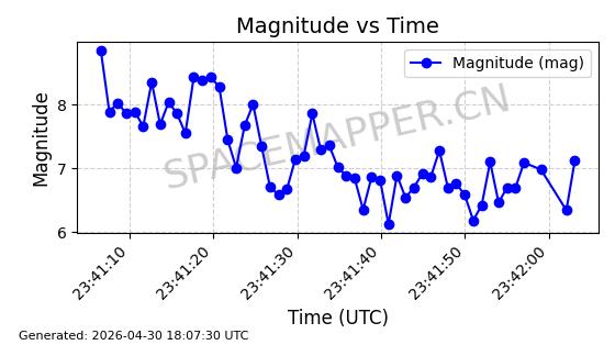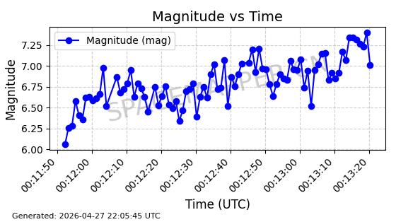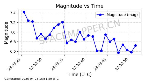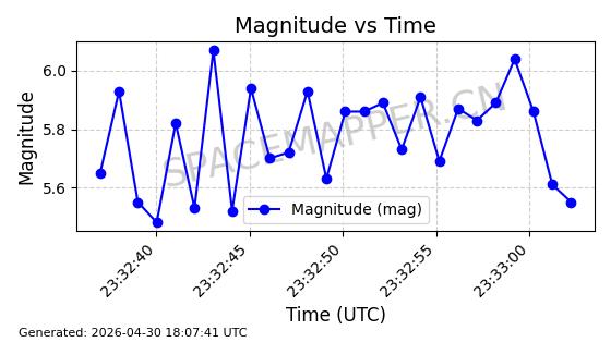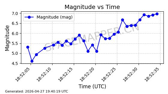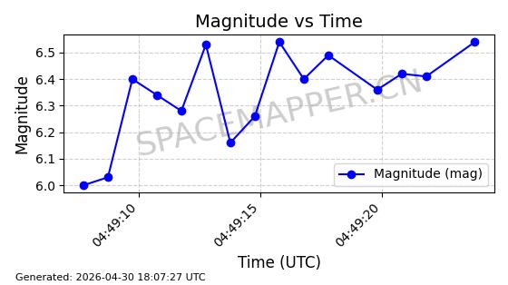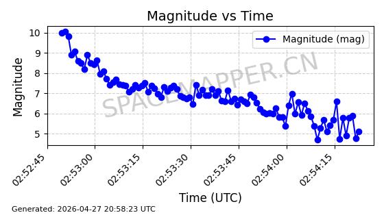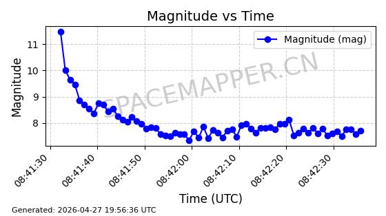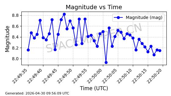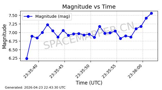| STARLINK-4554 | 53626 | 53626 | 2022-08-28 同日期轨道 2022-104AQ 同批次轨道 | 在轨 | 95分钟 | 53.2195 | 538.805 | 540.703 | 0.0001371 | 2026-04-30 01:11:01 | ||