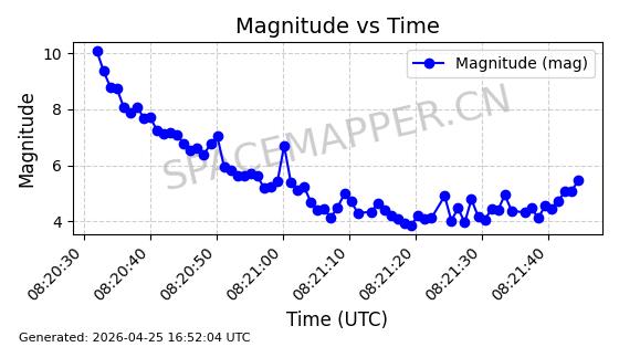 | STARLINK-4547 | 53573 | 53573 | 2022-08-19 同日期轨道 2022-101AY 同批次轨道 | 已陨落 | 87分钟 | 53.1970 | 141.045 | 147.245 | 0.0004752 | 2025-10-31 08:35:12 | ||