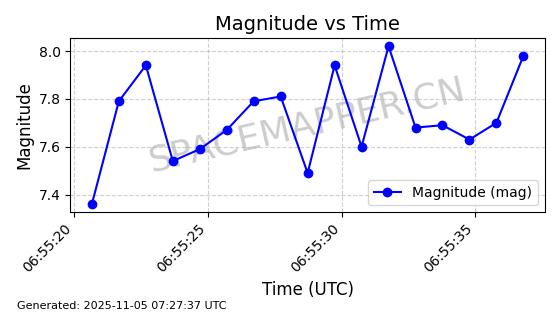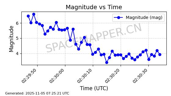 | STARLINK-5393 | 54832 | 54832 | 2022-12-28 同日期轨道 2022-177N 同批次轨道 | 已陨落 | 88分钟 | 42.9837 | 163.994 | 171.96 | 0.0006084 | 2025-10-18 23:13:28 | ||