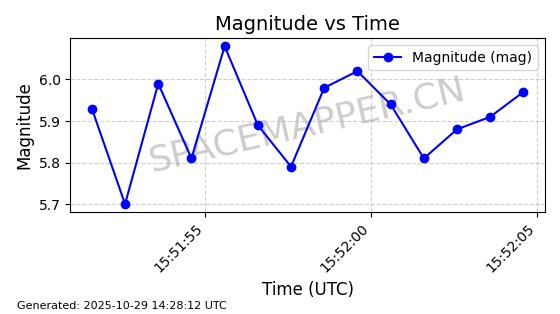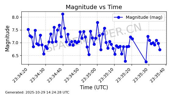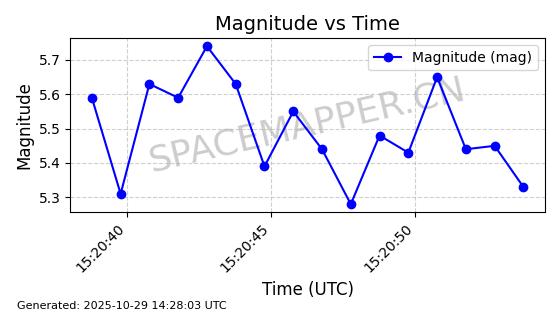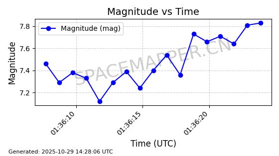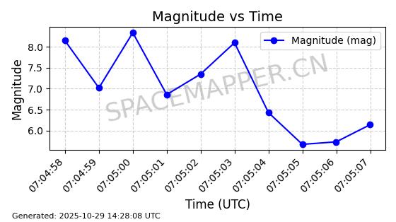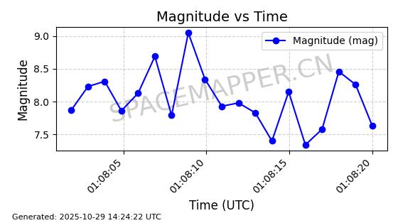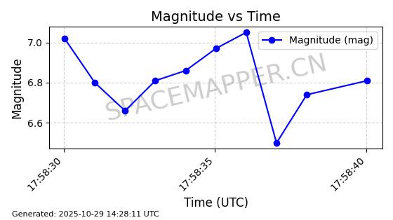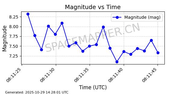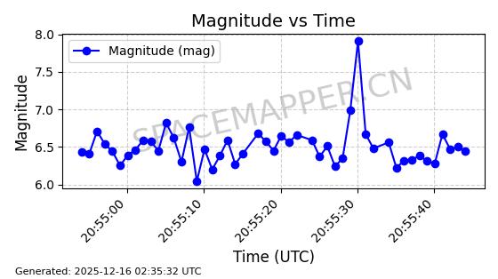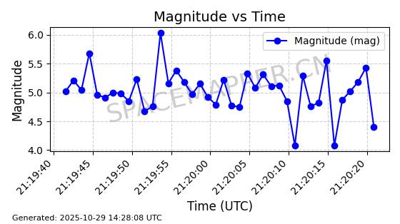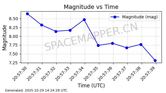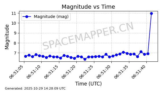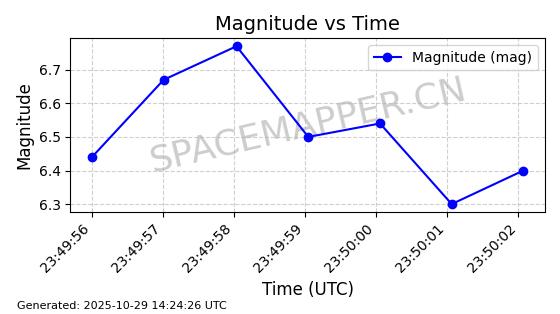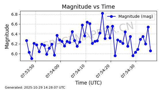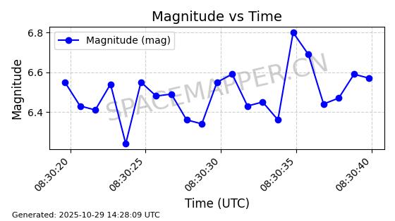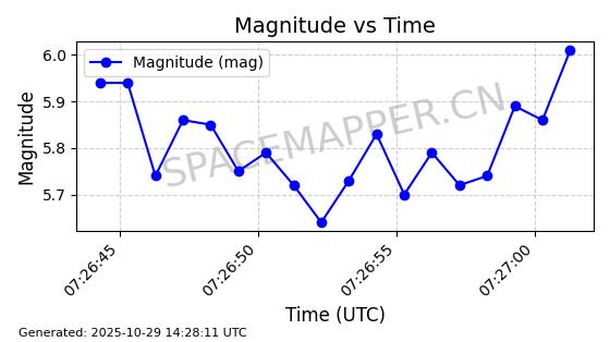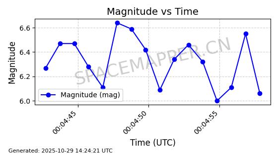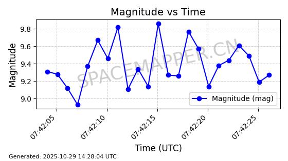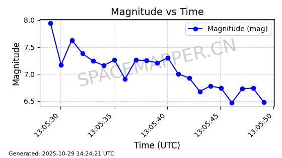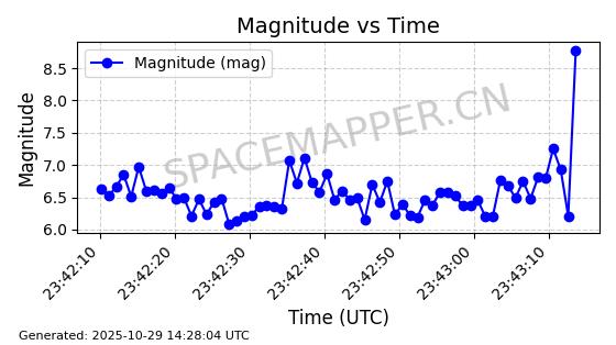 | STARLINK-1449 | 45666 | 45666 | 2020-06-04 同日期轨道 2020-035K 同批次轨道 | 已陨落 | 87分钟 | 53.0110 | 145.29 | 151.54 | 0.0004788 | 2025-05-07 19:13:57 | ||