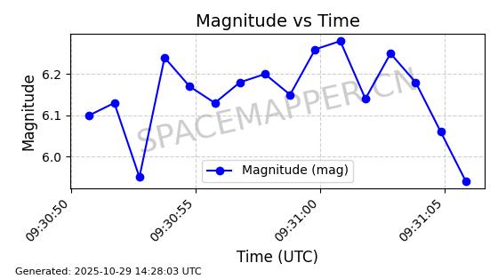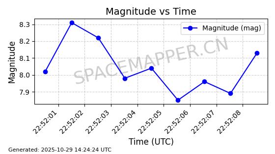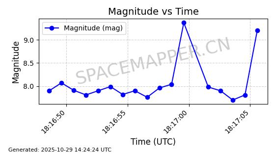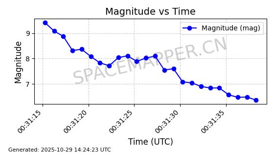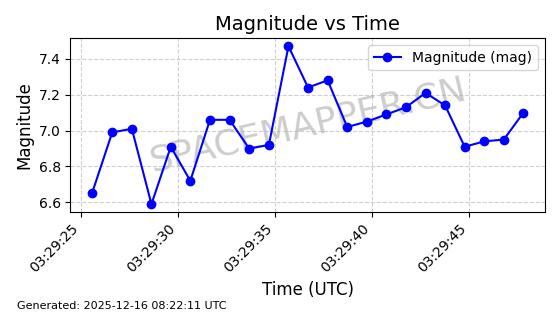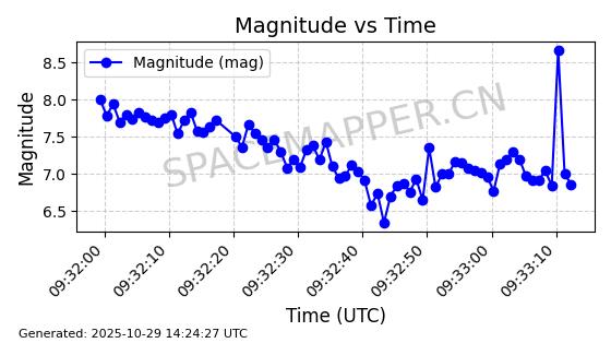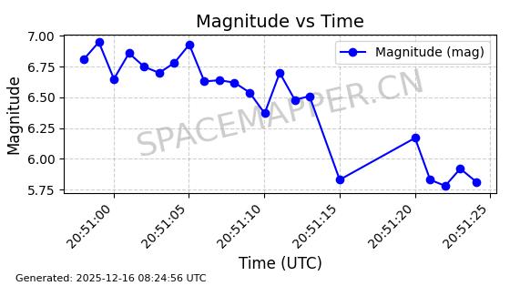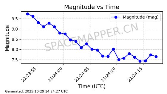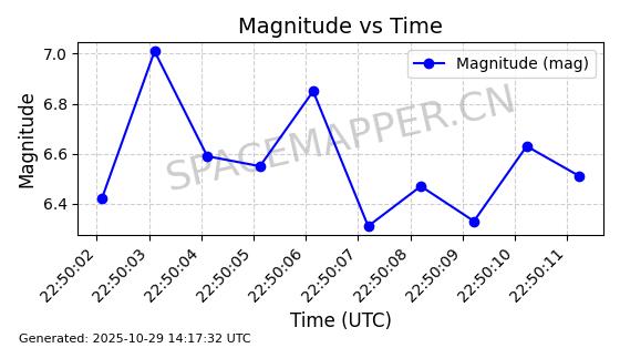 | STARLINK-1355 | 45563 | 45563 | 2020-04-22 同日期轨道 2020-025AJ 同批次轨道 | 已陨落 | 88分钟 | 53.0184 | 157.772 | 161.162 | 0.0002592 | 2025-09-25 16:17:37 | ||