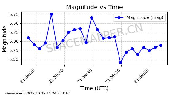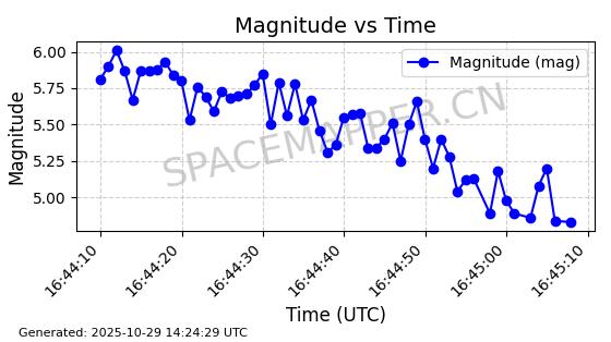 | STARLINK-1332 | 45579 | 45579 | 2020-04-22 同日期轨道 2020-025BA 同批次轨道 | 已陨落 | 88分钟 | 53.0181 | 150.402 | 160.55 | 0.0007765 | 2025-05-05 21:19:46 | ||