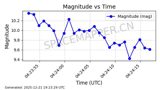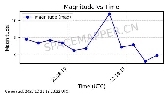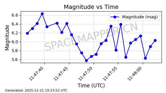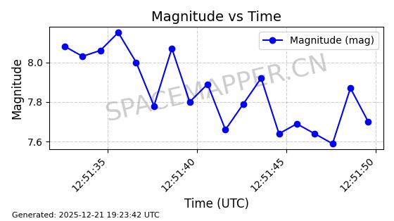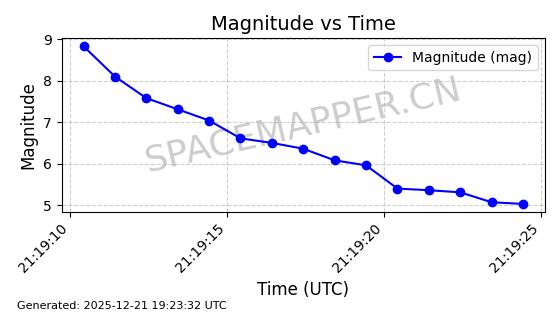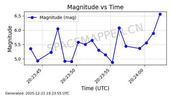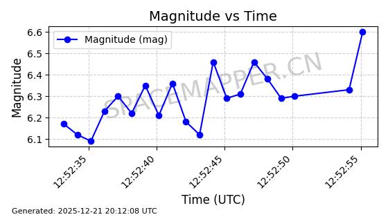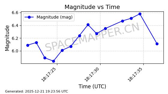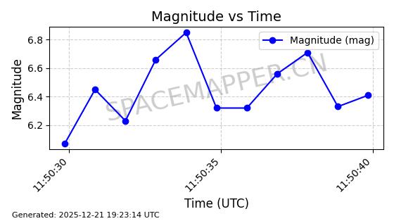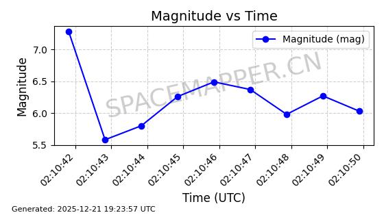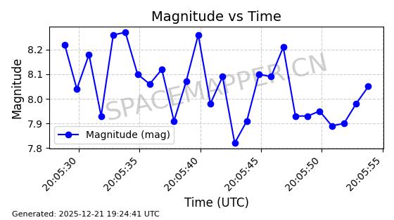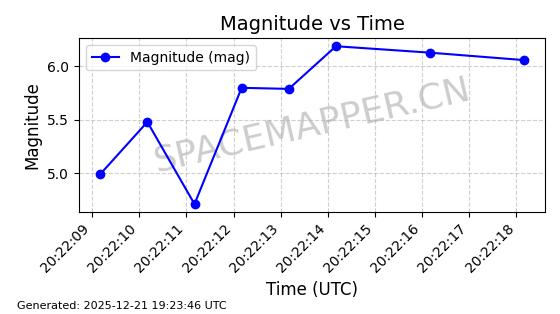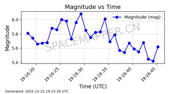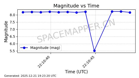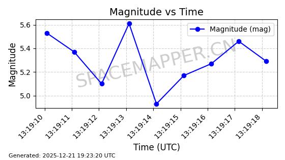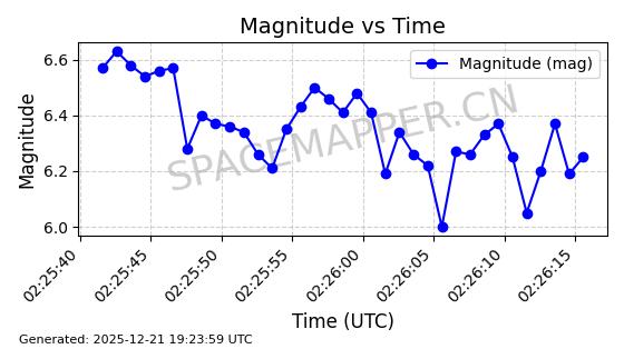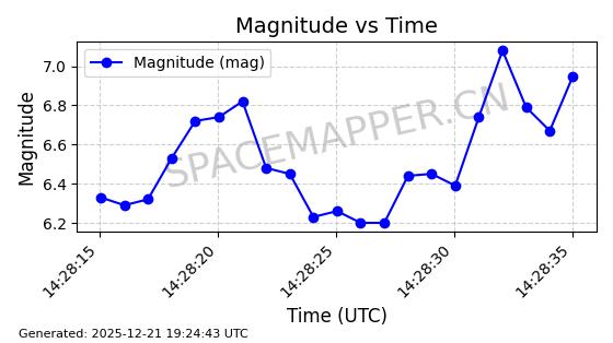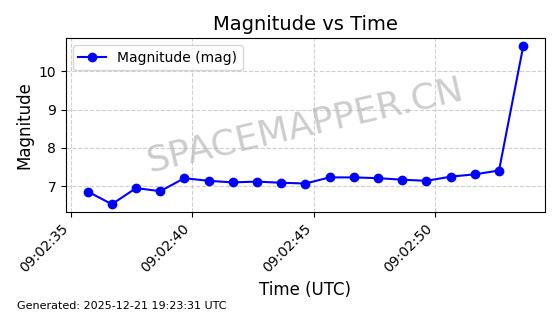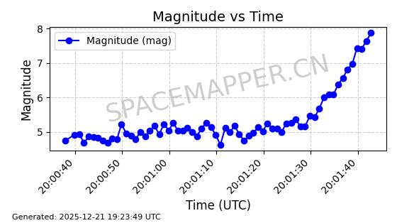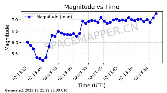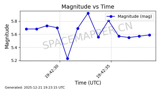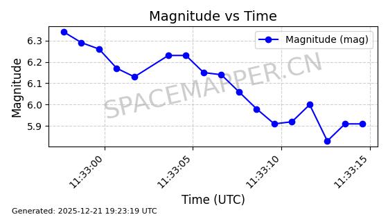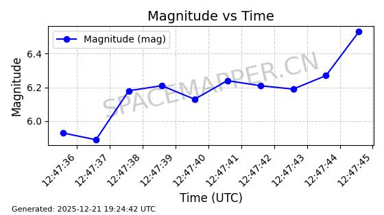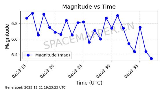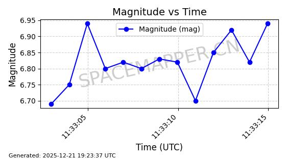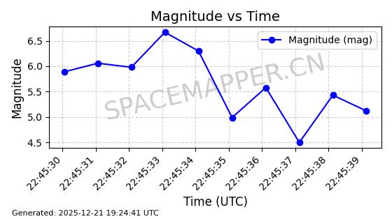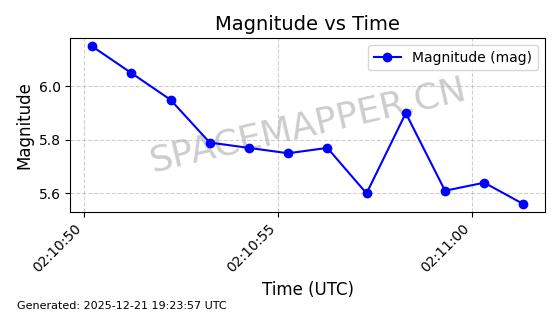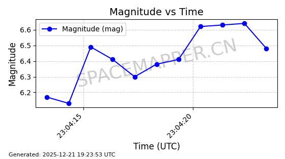 | STARLINK-6325 | 56789 | 56789 | 2023-05-31 同日期轨道 2023-078Y 同批次轨道 | 已陨落 | 88分钟 | 69.9883 | 147.542 | 159.758 | 0.0009351 | 2025-09-16 19:00:34 | ||