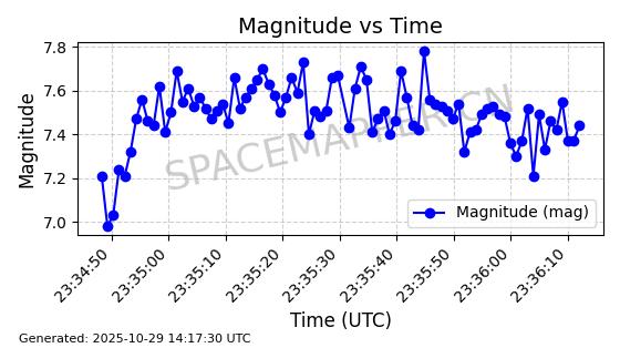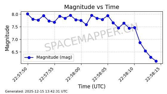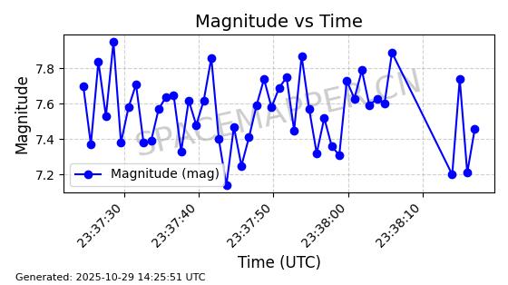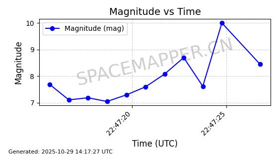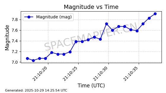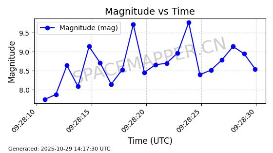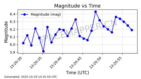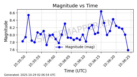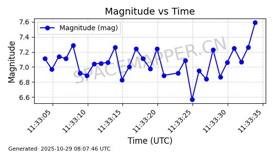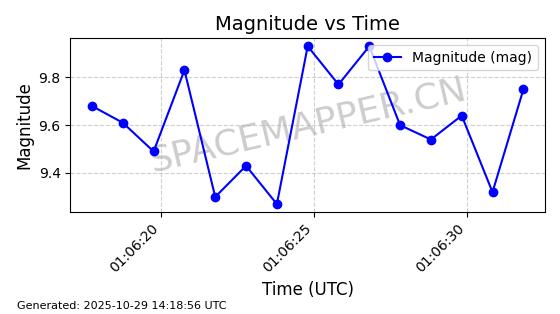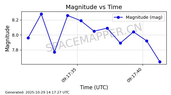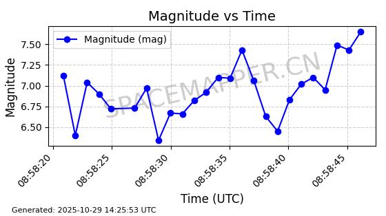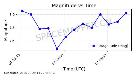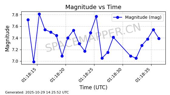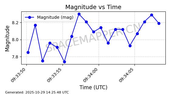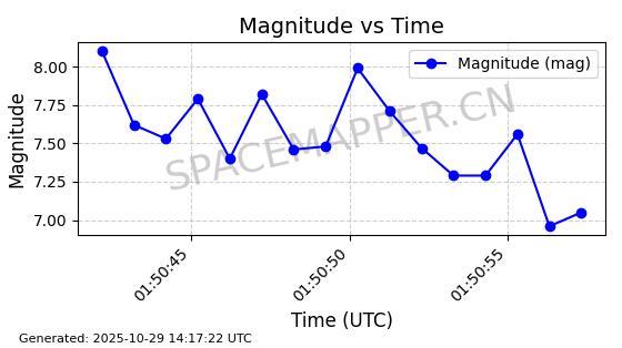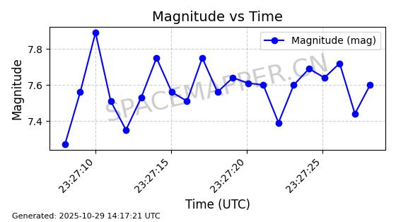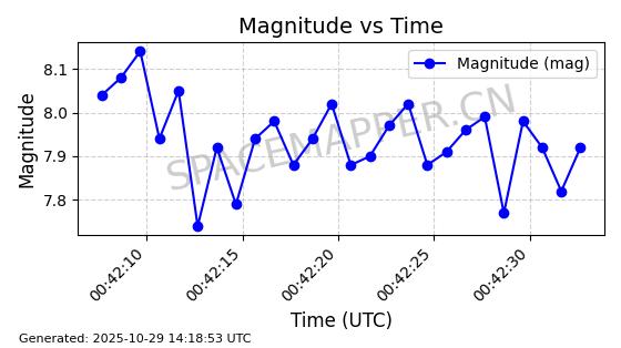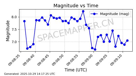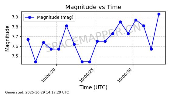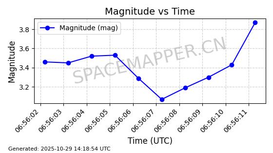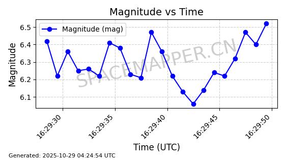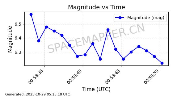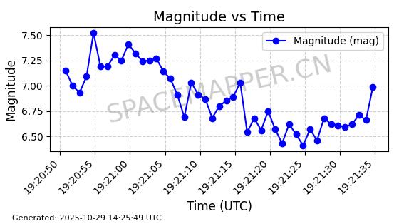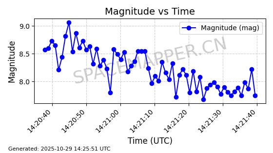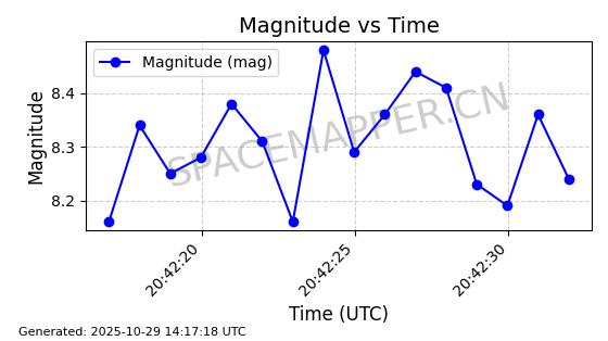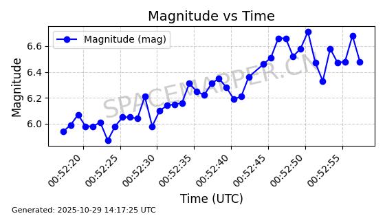 | STARLINK-1588 | 46118 | 46118 | 2020-08-18 同日期轨道 2020-057B 同批次轨道 | 已陨落 | 87分钟 | 53.0242 | 127.628 | 137.706 | 0.0007738 | 2025-05-31 21:24:49 | ||