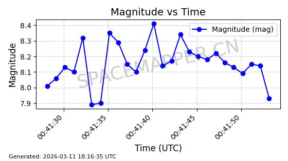 | 卫星名称 | AOE ID | NORAD ID | 发射日期 国际编号 | 在轨状态 | 轨道周期 | 轨道倾角 (度) | 近地点 (Km) | 远地点 (Km) | 偏心率 | 更新时间 (UTC) | 近期光变曲线 | 服务 |