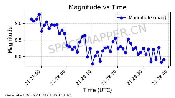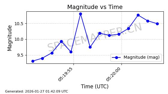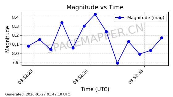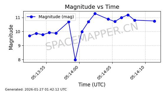 | TIANQI 27 | 59911 | 59911 | 2024-05-29 同日期轨道 2024-102C 同批次轨道 | 在轨 | 103分钟 | 44.9768 | 892.27 | 901.478 | 0.0006328 | 2026-01-27 05:32:52 | ||