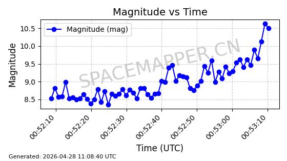 | TIANQI 28 | 59912 | 59912 | 2024-05-29 同日期轨道 2024-102D 同批次轨道 | 在轨 | 103分钟 | 44.9770 | 888.571 | 904.907 | 0.0011227 | 2026-04-28 07:02:35 | ||