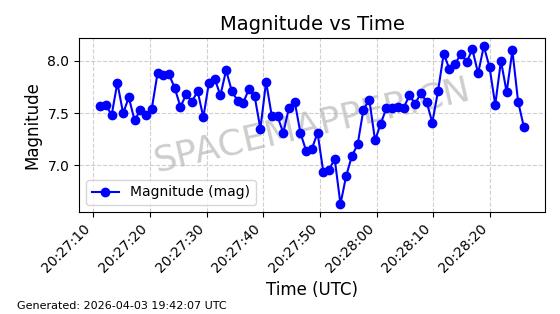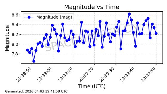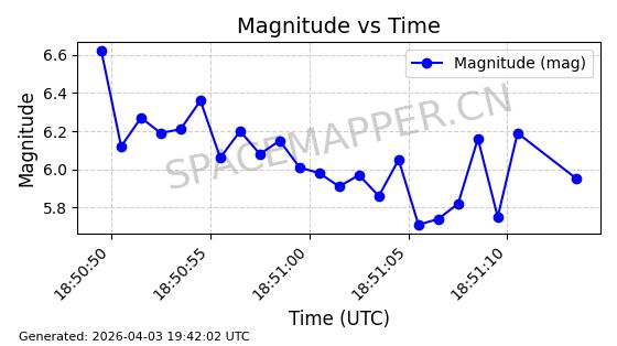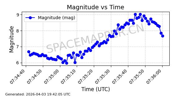 | QIANFAN-61 | 62791 | 62791 | 2025-01-23 同日期轨道 2025-016G 同批次轨道 | 在轨 | 107分钟 | 88.9728 | 1056.877 | 1080.237 | 0.0015684 | 2026-04-03 06:41:16 | ![]() | |