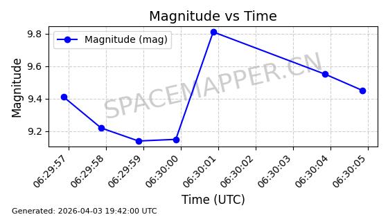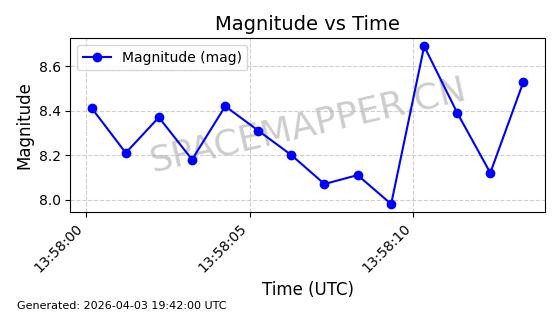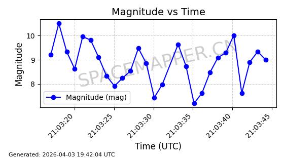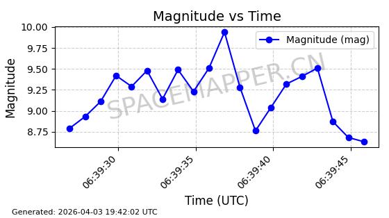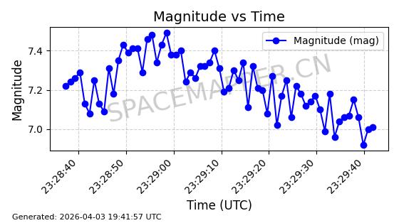 | QIANFAN-97 | 66039 | 66039 | 2025-10-17 同日期轨道 2025-233G 同批次轨道 | 在轨 | 107分钟 | 88.9987 | 1066.77 | 1070.34 | 0.0002397 | 2026-04-03 06:38:02 | ![]() | |