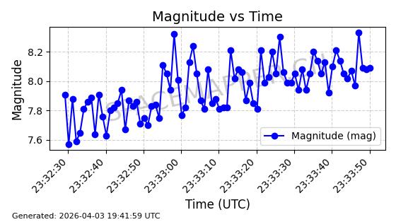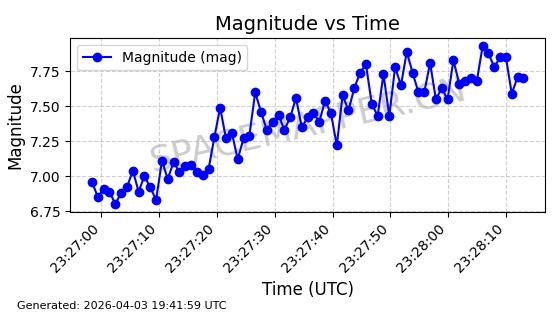 | QIANFAN-70 | 62800 | 62800 | 2025-01-23 同日期轨道 2025-016R 同批次轨道 | 在轨 | 107分钟 | 88.9678 | 1056.55 | 1080.554 | 0.0016117 | 2026-04-03 06:05:45 | ![]() | |