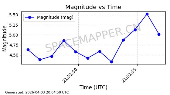 | STARLINK-11083 | 59424 | 59424 | 2024-04-07 同日期轨道 2024-065D 同批次轨道 | 在轨 | 92分钟 | 53.1574 | 358.982 | 360.252 | 0.0000941 | 2026-04-03 02:02:59 | ||