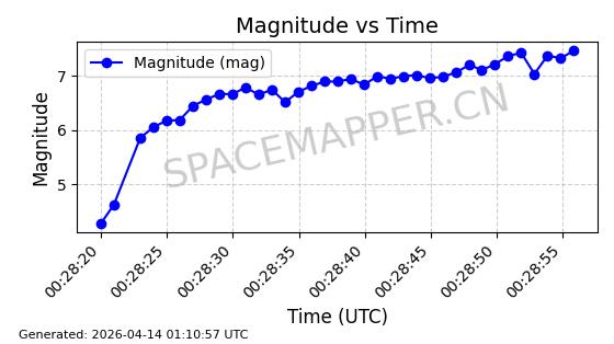| 卫星名称 | AOE ID | NORAD ID | 发射日期 国际编号 | 在轨状态 | 轨道周期 | 轨道倾角 (度) | 近地点 (Km) | 远地点 (Km) | 偏心率 | 更新时间 (UTC) | 近期光变曲线 | 服务 |