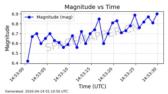 | STARLINK-32266 | 60369 | 60369 | 2024-08-04 同日期轨道 2024-138Q 同批次轨道 | 已陨落 | 89分钟 | 53.1160 | 203.616 | 210.772 | 0.0005433 | 2026-02-22 05:55:57 | ||