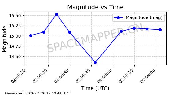 | BEIDOU 3M20 | 44865 | 44865 | 2019-12-16 同日期轨道 2019-090B 同批次轨道 | 在轨 | 773分钟 | 56.5180 | 21479.278 | 21576.806 | 0.0017474 | 2026-04-26 09:49:21 | ||