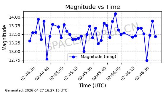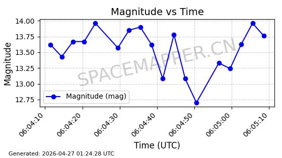 | BEIDOU 14 | 38774 | 38774 | 2012-09-18 同日期轨道 2012-050A 同批次轨道 | 在轨 | 773分钟 | 56.3974 | 21405.899 | 21646.149 | 0.0043049 | 2026-04-26 22:49:59 | ||