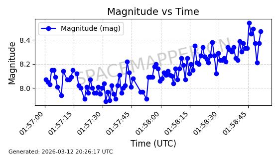 | GLOBALSTAR M060 | 26083 | 26083 | 2000-02-08 同日期轨道 2000-008C 同批次轨道 | 在轨 | 118分钟 | 52.0049 | 1600.222 | 1605.148 | 0.0003086 | 2026-03-12 23:36:55 | ||