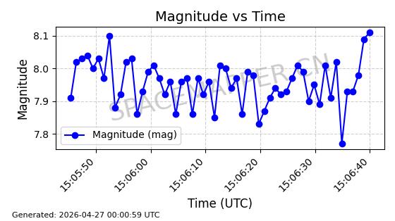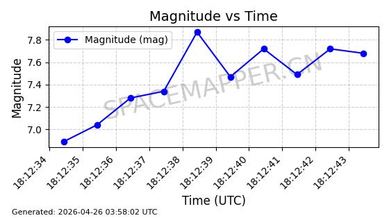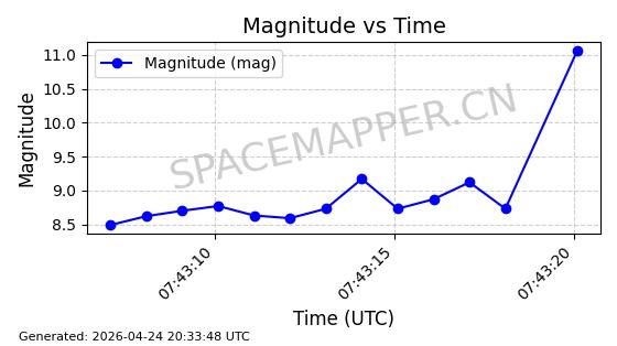 | JILIN-01-08 | 43160 | 43160 | 2018-01-19 同日期轨道 2018-008F 同批次轨道 | 在轨 | 94分钟 | 97.1842 | 463.879 | 469.731 | 0.0004274 | 2026-04-27 07:44:00 | ||