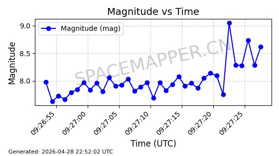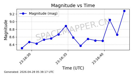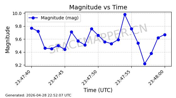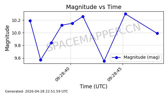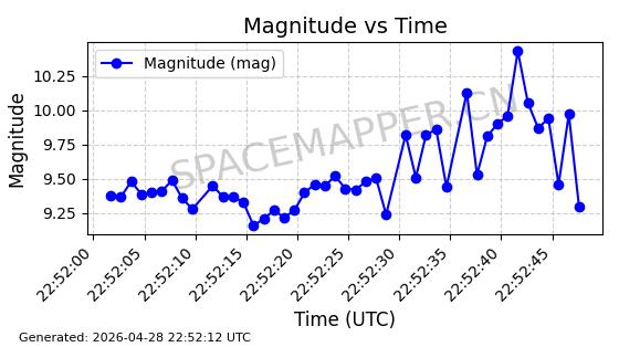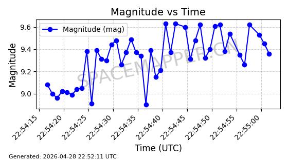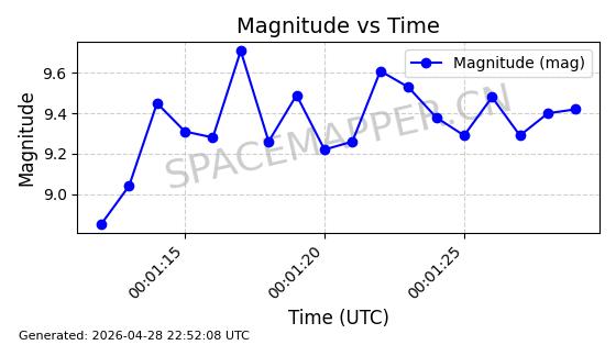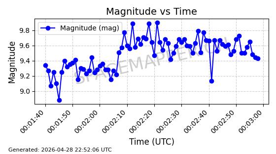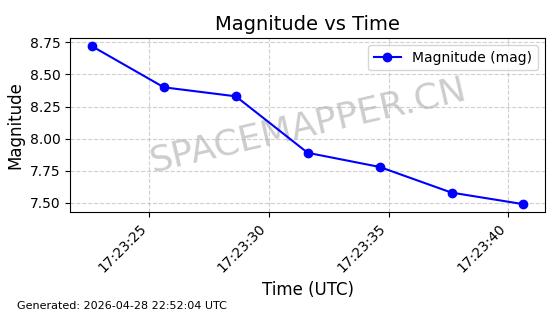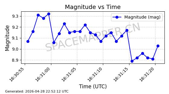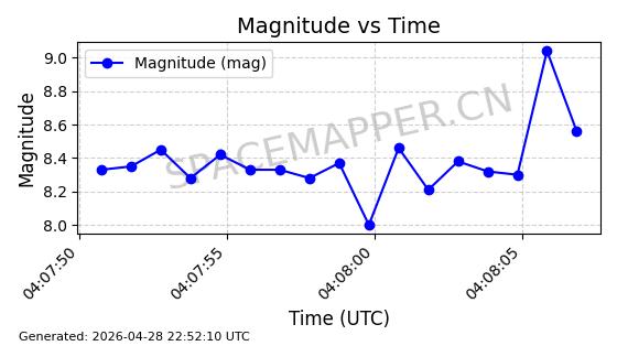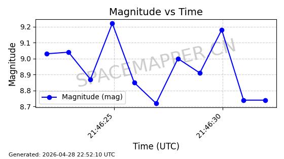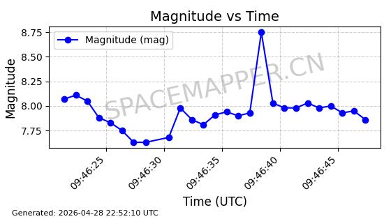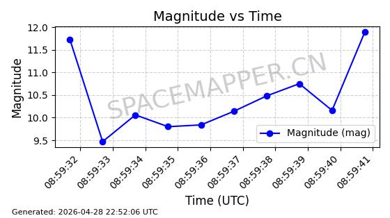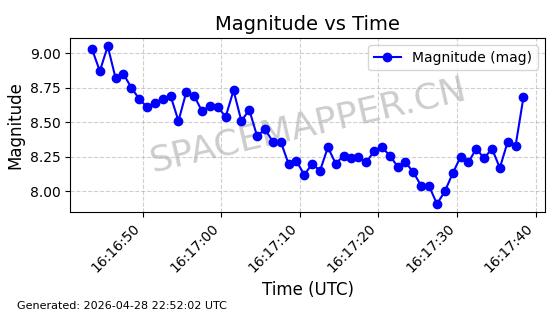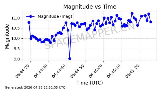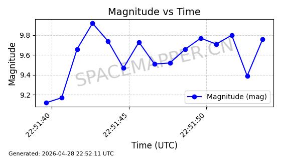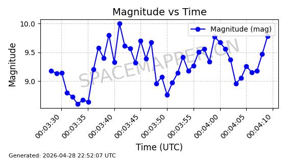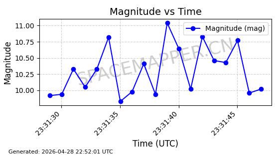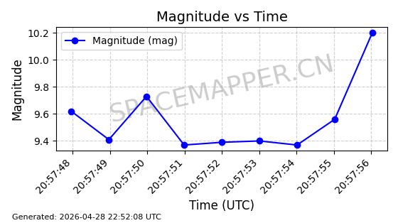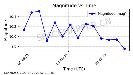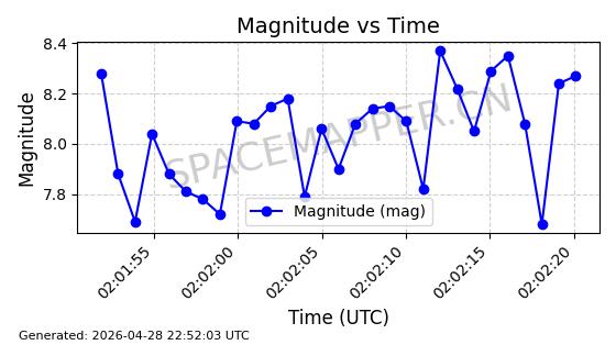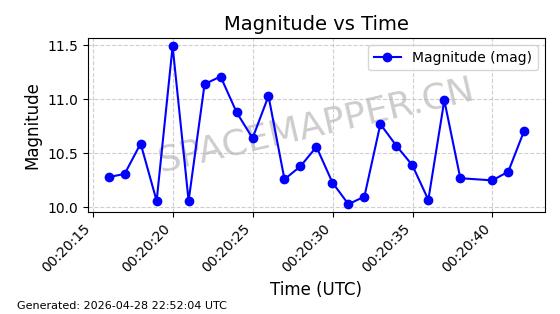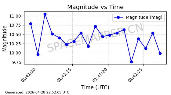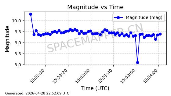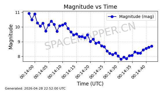 | ONEWEB-0228 | 48780 | 48780 | 2021-05-28 同日期轨道 2021-045P 同批次轨道 | 在轨 | 109分钟 | 87.8971 | 1200.385 | 1203.157 | 0.0001828 | 2026-04-28 03:00:44 | ||