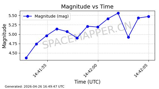 | STARLINK-11090 | 59422 | 59422 | 2024-04-07 同日期轨道 2024-065B 同批次轨道 | 在轨 | 92分钟 | 53.1581 | 359.325 | 360.219 | 0.0000663 | 2026-04-26 13:40:14 | ||