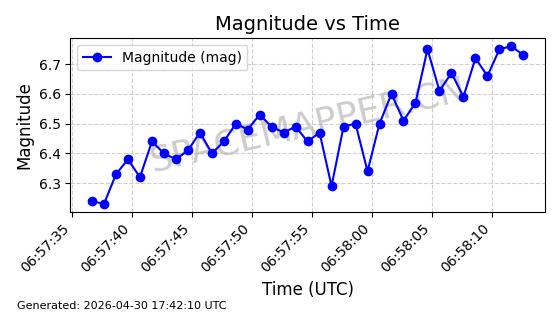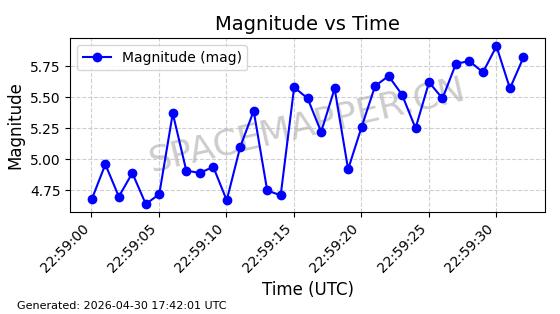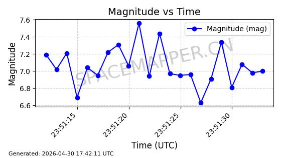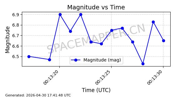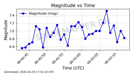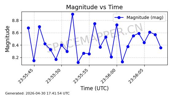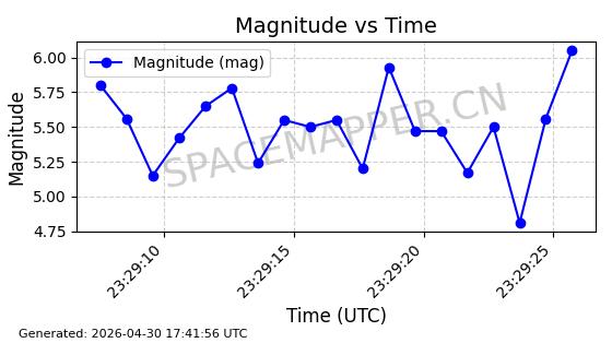| STARLINK-30362 | 57745 | 57745 | 2023-09-01 同日期轨道 2023-131P 同批次轨道 | 在轨 | 94分钟 | 42.9972 | 482.318 | 483.85 | 0.0001115 | 2026-04-30 00:44:04 | ||