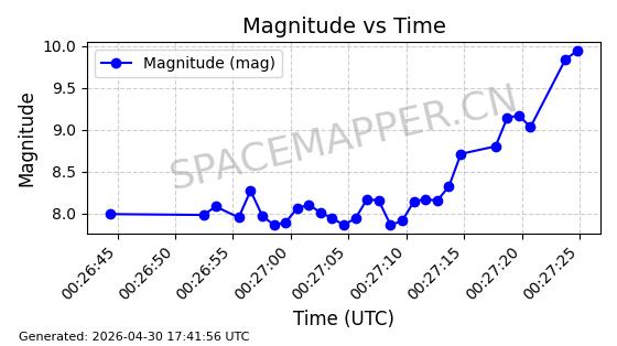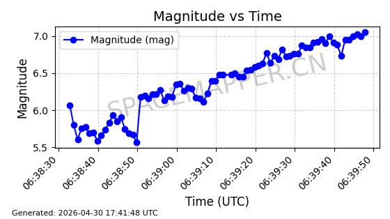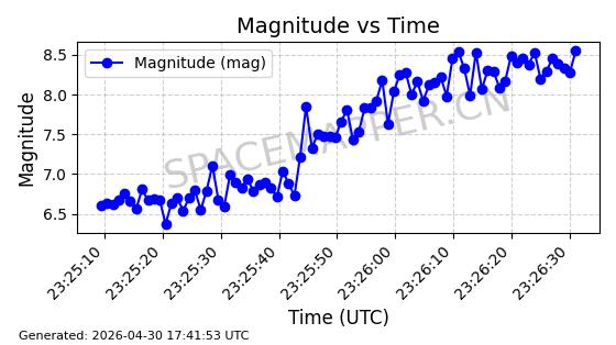 | STARLINK-30318 | 57711 | 57711 | 2023-08-27 同日期轨道 2023-129P 同批次轨道 | 在轨 | 94分钟 | 42.9995 | 482.21 | 483.888 | 0.0001222 | 2026-04-30 04:46:18 | ||