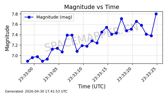 | STARLINK-30333 | 57702 | 57702 | 2023-08-27 同日期轨道 2023-129E 同批次轨道 | 在轨 | 94分钟 | 42.9978 | 482.436 | 483.662 | 0.0000893 | 2026-04-30 04:40:46 | ||