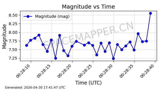 | STARLINK-30321 | 57679 | 57679 | 2023-08-22 同日期轨道 2023-124S 同批次轨道 | 在轨 | 94分钟 | 53.1603 | 474.723 | 475.699 | 0.0000712 | 2026-04-29 20:20:57 | ||