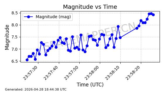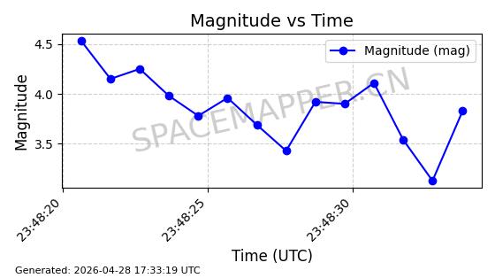 | STARLINK-11423 | 61950 | 61950 | 2024-11-14 同日期轨道 2024-209M 同批次轨道 | 在轨 | 92分钟 | 53.1574 | 358.879 | 360.165 | 0.0000953 | 2026-04-28 04:44:19 | ||