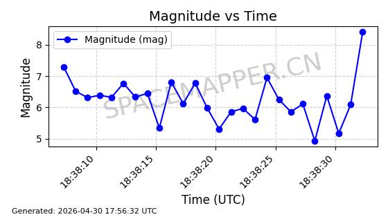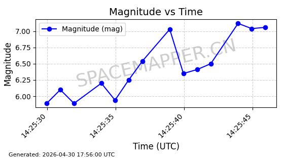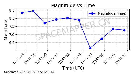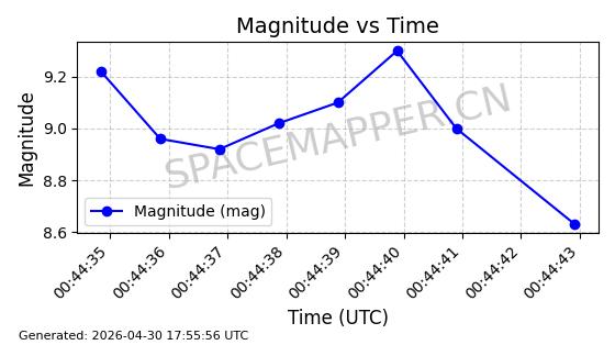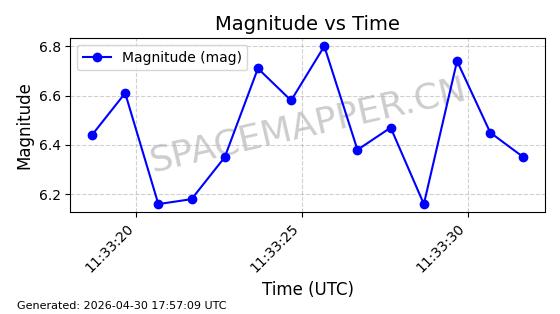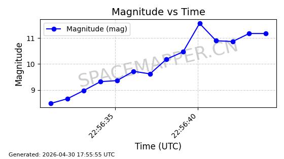 | STARLINK-5089 | 56148 | 56148 | 2023-03-29 同日期轨道 2023-046BJ 同批次轨道 | 在轨 | 94分钟 | 43.0038 | 484.591 | 486.533 | 0.0001414 | 2026-04-30 05:10:00 | ||