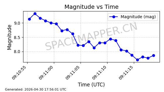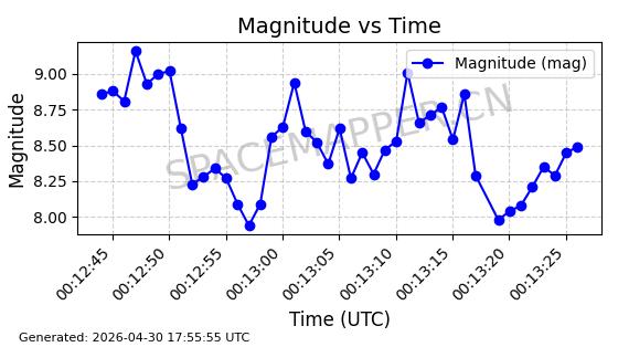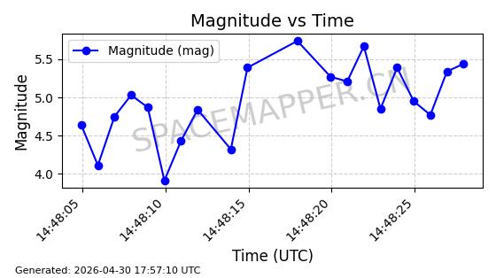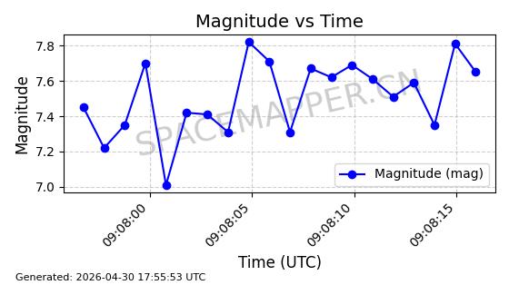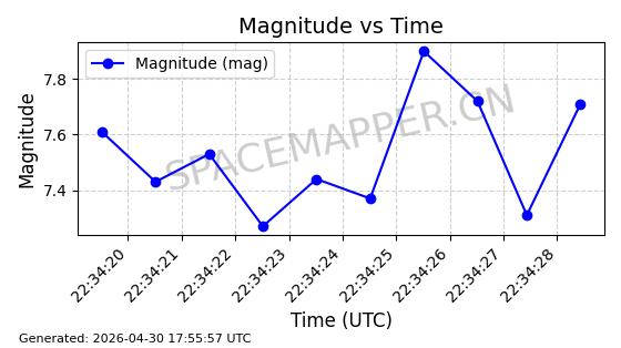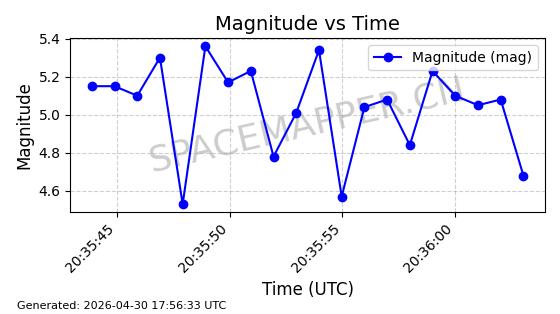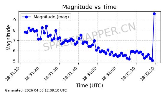 | STARLINK-5088 | 54000 | 54000 | 2022-10-05 同日期轨道 2022-125AN 同批次轨道 | 在轨 | 95分钟 | 53.2184 | 538.842 | 540.624 | 0.0001287 | 2026-04-29 20:23:38 | ||